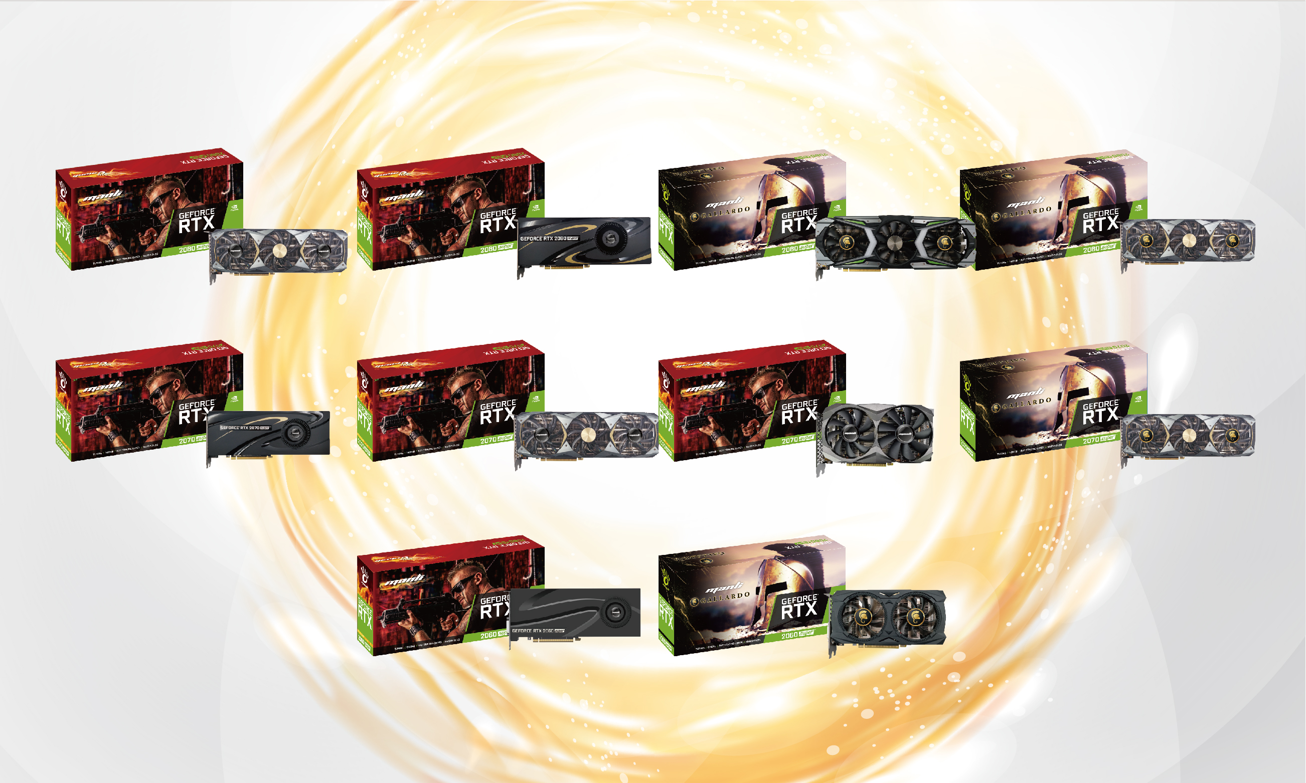 Manli GeForce®RTX超级系列采用了获奖的NVIDIA Turing架构,为GPU带来了更多的核心、更高的时钟和更快的内存 比原来的rtx20系列快25%。与此同时,Manli GeForce®RTX超级家族 与新形象的包装设计和各种冷却解决方案,从“太极”的象征 风机风格的风扇,迷你双冷却器,三重冷却器,Gallardo系列的三重冷却器与LED 灯和Gallardo系列三重冷却器与定制的LED效果,以满足不同的需求。