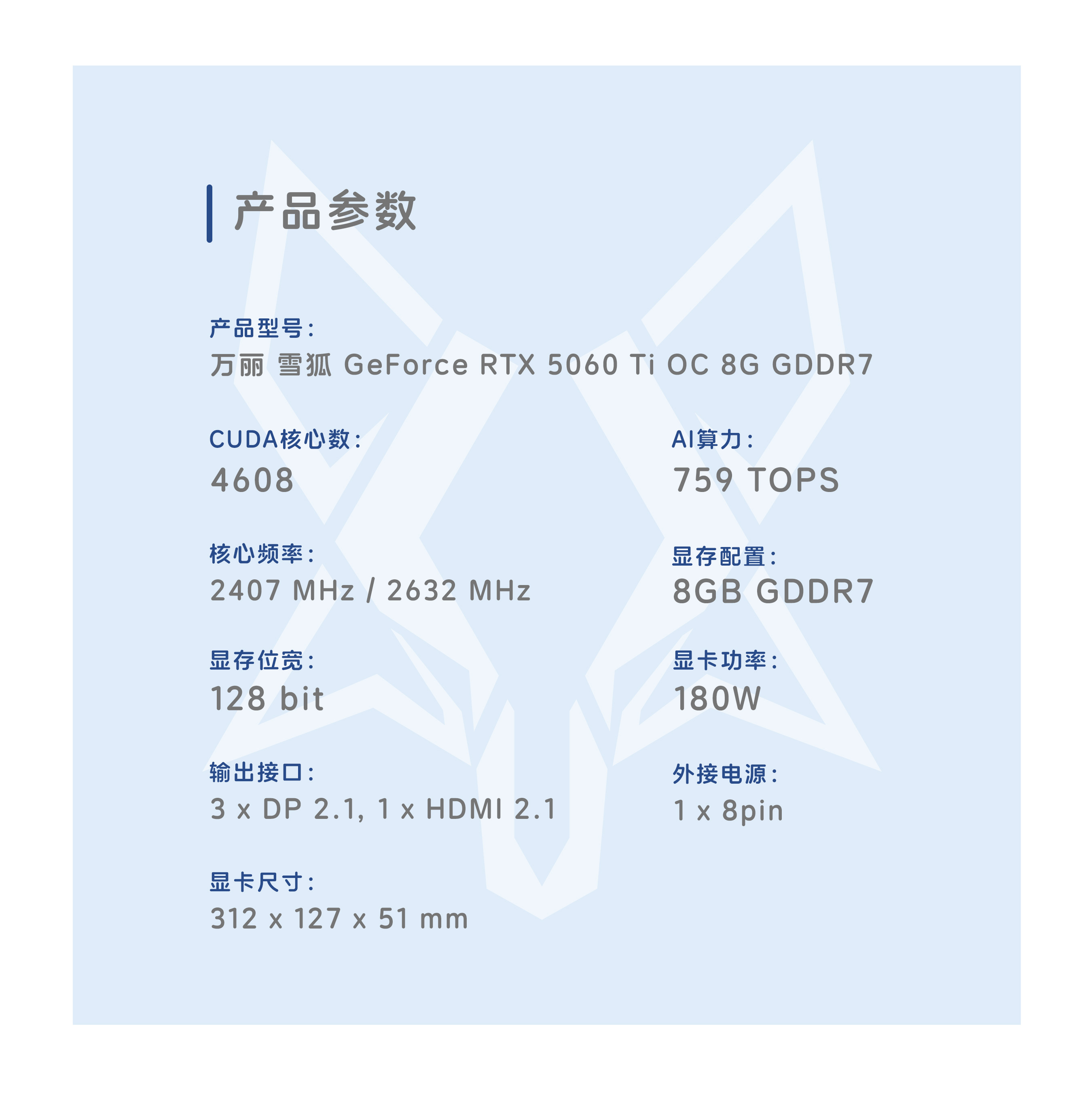 | 产品名称 | 万丽 雪狐 GeForce RTX 5060 Ti OC 8GB GDDR7 三风扇 |